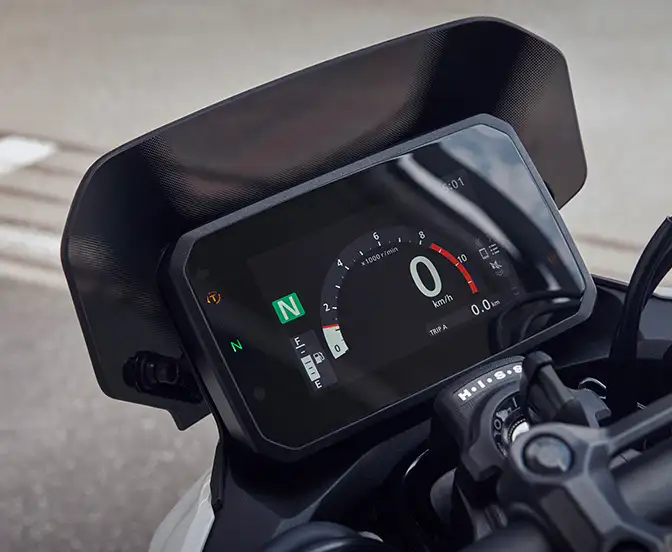 O novo display TFT colorido de 5” da Honda Hornet 500 oferece ótima visibilidade e leitura intuitiva. O painel da moto oferece duas opções de iluminação de fundo, com ajuste automático e diferentes formatos para apresentação dos dados na tela. Tudo isso comandado por um novo seletor multifuncional e retroiluminado.